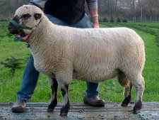 Ein Enkel von King. Im Gegensatz zu seinem Großvater hat er eine sehr schöne Kopfbewollung. Auffällig rassetypischer Zuchtbock, stark bemuskelt, großrahmig, gerade Oberlinie, korrektes Fundament, sehr guter Fleischvererber. Ein insgesamt sehr harmonischer Bock mit sehr guten, ausgeprägten Innen- und Außenkeulen.